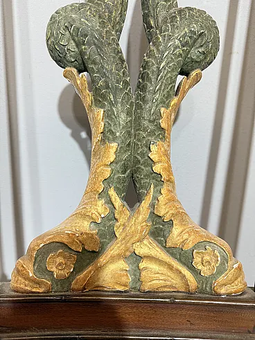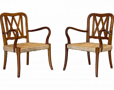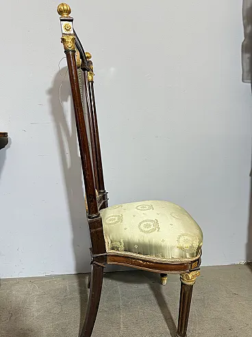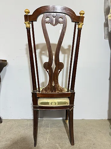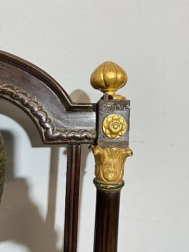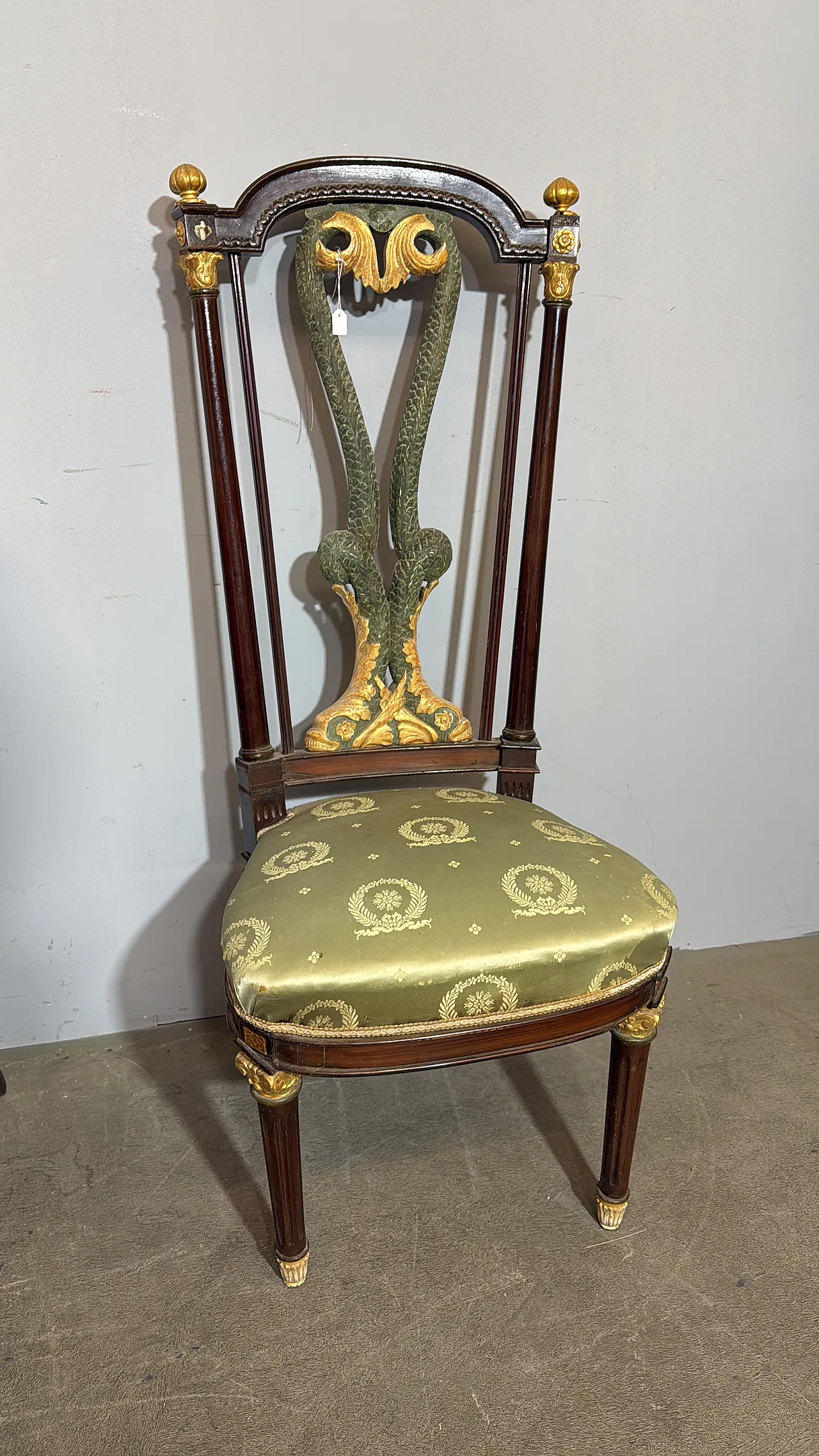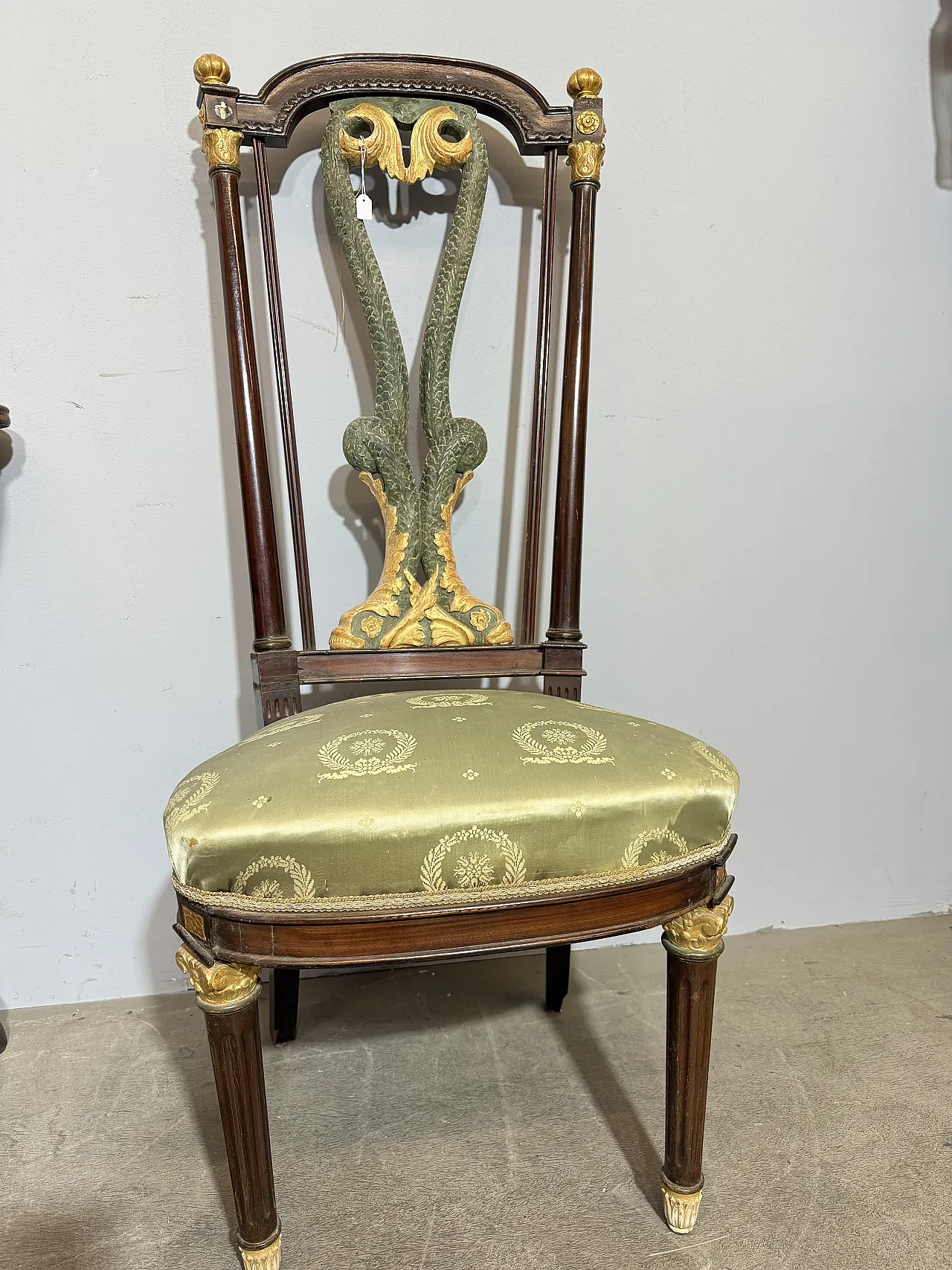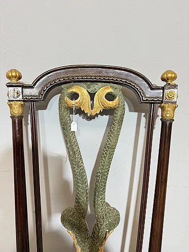 Chair/armchair, first empire, early 1800s with dolphins, 121x53x45 cm. Walnut wood, golden elements and back with crossed dolphins and paintings. Mis H Tot 121, H Sitting 50 cm. Seat 53x 45 cm of depth.