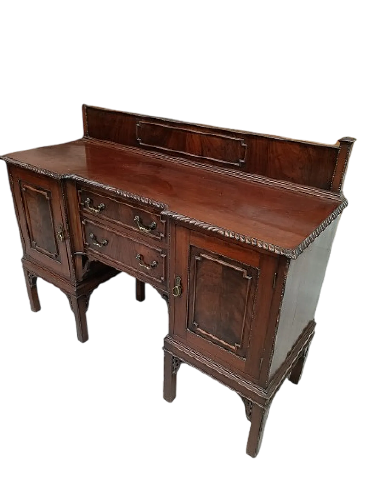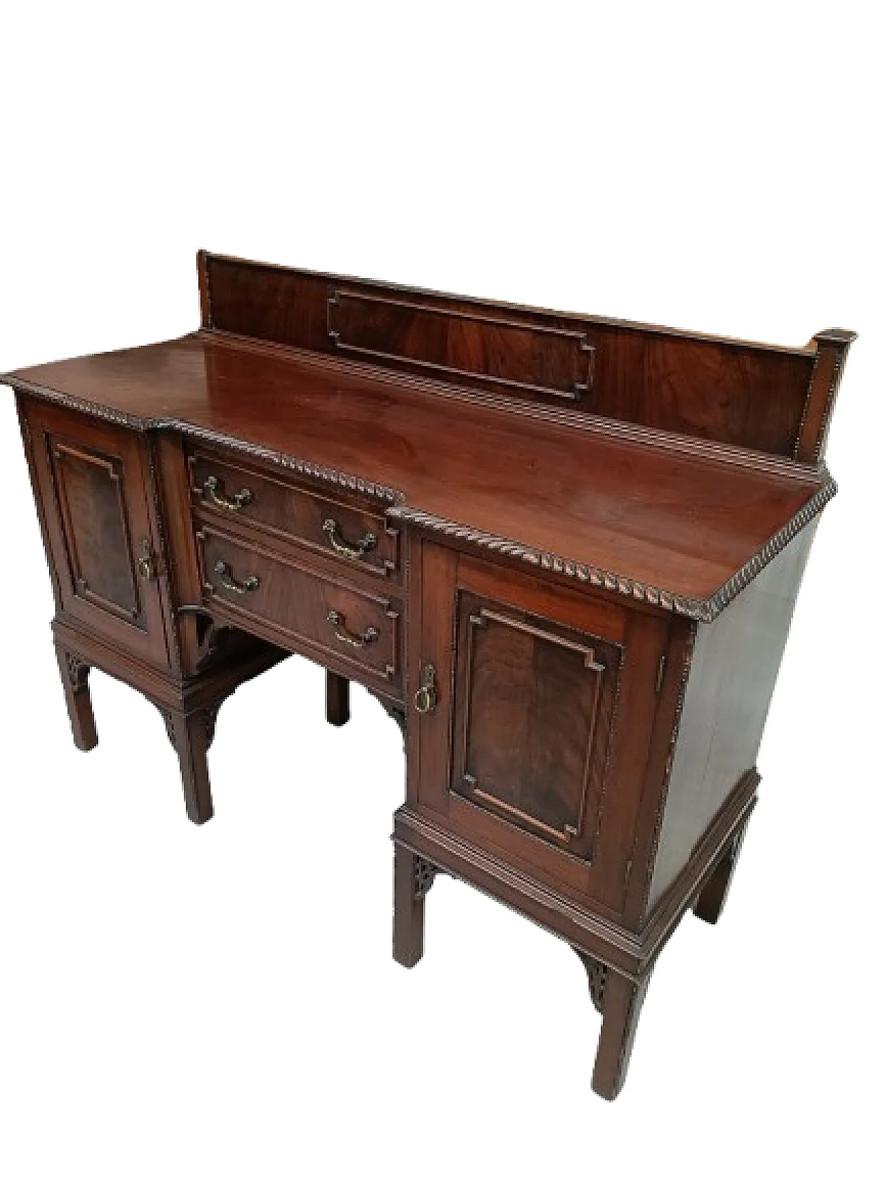 Refined English sideboard in Edhaardian style, dating back to the early twentieth century. Made of solid mahogany with splendid inlays and natural veins, it has two lateral doors, three central drawers with original brass handles and a shin -processed back.