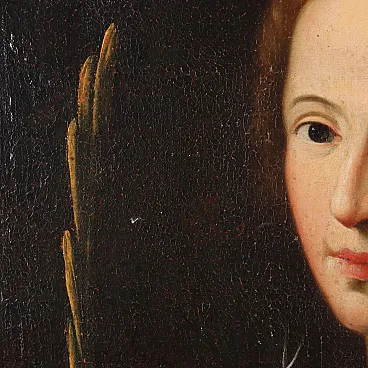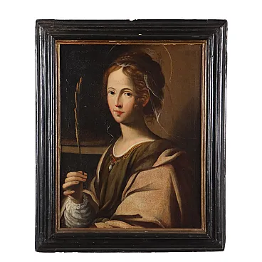 Oil on canvas. The young and beautiful girl, haloed, has as her only iconographic attribute the palm branch, symbol of martyrdom; dressed soberly but with refinement, she has on her head a light white veil, symbol of her consecration as bride of Christ. The painting, restored and relined, is presented in an ancient frame.