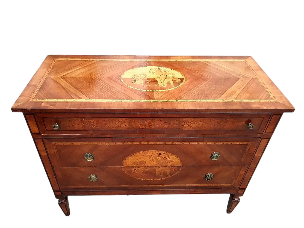 Elegant Louis XVI dresser of Italian manufacture, dating back to the end of the eighteenth century. Made of precious walnut wood and embellished with refined inlays in the style of Giuseppe Maggiolini, depicting classic scenes with putti. The cabinet has three large drawers with original chiseled brass handles and grooved truncroconic legs, typical of the neoclassical style. The polishing is performed in buffer shellac, as per tradition. Perfect for refined environments, this piece represents an authentic testimony of Italian ebanist art of the 1900s. Dimensions: L 120 × P 52 × h 94 cm