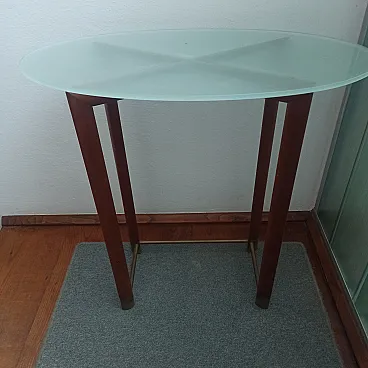 Daniela Puppa's oval table for Fontana Arte, 80s. Crystal top, wooden structure and brass. It reports normal traces of time and use and some light sign on the floor and on the wood. Daniela Puppa, a multifaceted architect and designer, has made style and elegance its distinctive trait. Words: energy and curiosities applied to product and fashion design. Graduated from the Polytechnic of Milan, he begins as the editor of the Casabella magazine and participates in the birth of way. The world of design is approaching through experiments with Alchimia and Memphis groups. Since then he has not stopped, ranging from the world of furniture, to the illuminotechnics, to Textile Design. In parallel, in Paris he collaborates as an accessories designer for the LVMH and Dior group. With Fontana Arte has a longtime report: in the early 80s - under the artistic direction of Gae Aulenti - designed with Franco Raggi the installations for the events that feature the company. In 1992 he designed for the Milanese company first lady, land lamp with timeless elegance. He carries out teaching activities at the Polytechnic of Milan in the Faculty of Industrial Design, the IULM and the Domus Academy in Milan, where he holds seminars and is the rapporteur of projects concerning the connections between the fashion and design system