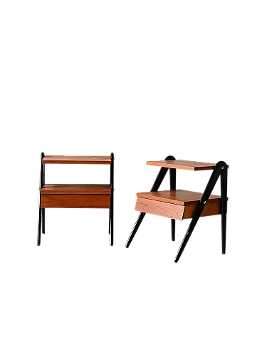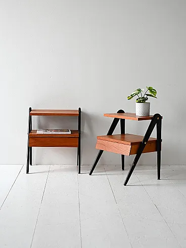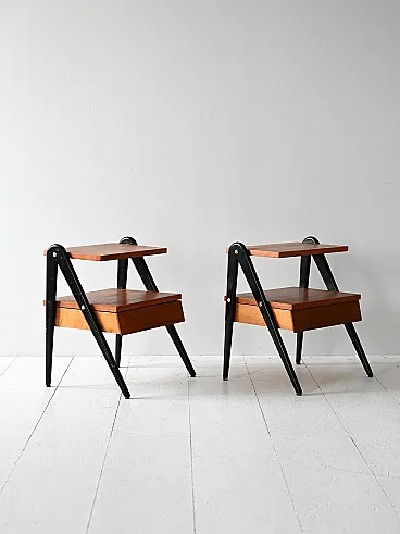 Vintage Scandinavian bedside tables with inclined structure, black finishes, an open shelf and an underlying drawer. Pair of Scandinavian bedside tables from the 1960s with wooden structure and black details in evidence. The inclined profile houses an open upper shelf and a drawer below. The combination between natural and matte black finish creates a strong graphic contrast, typical of some experiments of Nordic modernism. Good condition. They could present signs of time. Pleasure pay attention to the photographs.