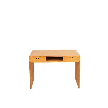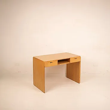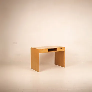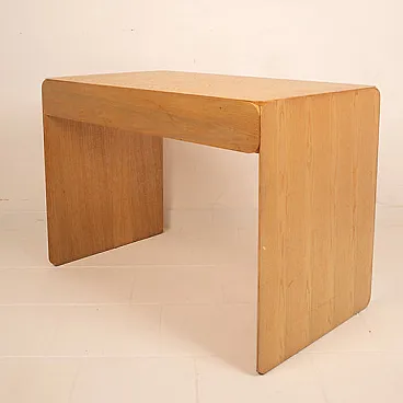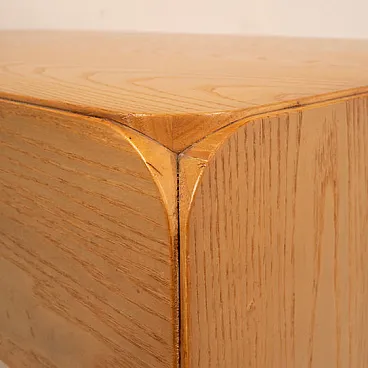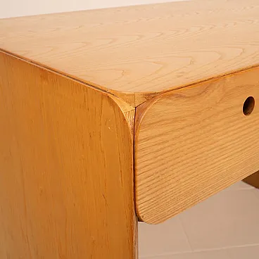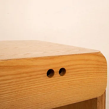 Elegant and measured, this desk designed by Derk Jan de Vries for Maisa Di Seveso is part of the rare and refined "Samara" series, an Italian collection of the 70s which today is considered a reference point in organic and functionalist design of the second half of the twentieth century. The desk is distinguished by the harmonious purity of its lines, the result of a project that combines the essentiality of Dutch modernism with love for natural materials typical of Italian artisan production. Entirely made of solid ash, it is characterized by the wise use of the veins of the wood as a decorative element and its rounded shapes, which soften the monolithic structure and enhance its tactility. The full sides are grafted continuously on the upper floor, drawing a fluid and compact silhouette, without barrels. The front is marked by two side drawers with iconic circular holes instead of handles - distinctive detail of the series - and from a central open compartment, useful for storing books, objects or desk materials. Each element is designed to be functional, but also visually balanced, with extreme care for the proportion and balance between full and empty. The "Samara" series, produced on a small scale and today increasingly difficult to find, represents an example of cultured and meditated design, capable of dialogue perfectly with modernist, Japan or Wabi-Sabi-style interiors. This desk is not only a piece of furniture, but a discreet and refined presence, ideal for those looking for an authentic piece, outside the fashions, which combines aesthetic and function with consistency and lightness.