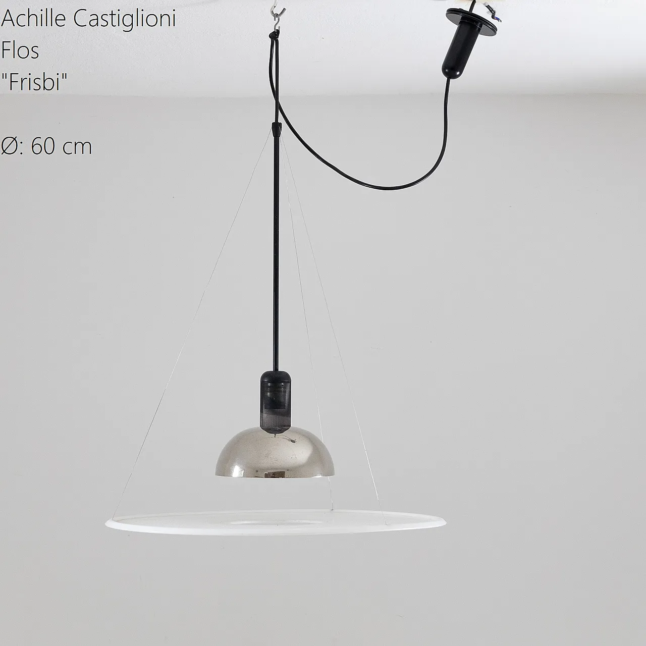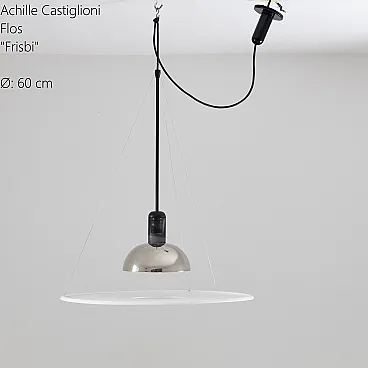 Iconic Suspension Lamp Frisbi model, designed by Achille Castiglioni for Flos in 1978. This project, fully entered the history of Italian design, stands out for its innovative character and light and balanced composition. The opal methacrylate diffuser disc (Ø 60 cm), suspended through three thin cables, reflects the light emitted by the central lighting body in chromed metal, creating direct and diffused lighting at the same time. The cable and counterweight system also allows a flexible and precise height adjustment.