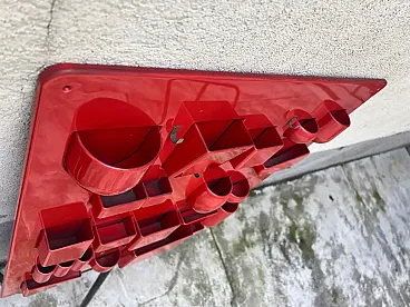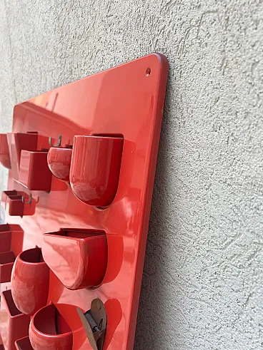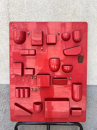 Questo iconico pannello contenitore Uten.Silo, disegnato da Ingo Maurer e Dorothee Becker (moglie di Maurer) nel 1969, è un perfetto esempio di design funzionale e ironico del secondo dopoguerra. Realizzato in ABS plastico rosso brillante, è dotato di contenitori di diverse forme e dimensioni, ganci e clip in metallo, progettati per organizzare con stile e versatilità piccoli oggetti domestici o da ufficio. La versione proposta mostra un evidente difetto in basso a sinistra: una crepa che non compromette la funzionalità ma fa parte della storia e dell’uso quotidiano di questo complemento. Ingo Maurer (1932-2019) è stato uno dei più innovativi designer e “poeti della luce” del XX secolo. Le sue creazioni sono conosciute per la capacità di unire arte e tecnologia, evocando emozioni e atmosfere suggestive. Il suo studio, Ingo Maurer GmbH, continua oggi a rappresentare un punto di riferimento nel mondo dell’illuminazione e del design. La Ingo Maurer GmbH, fondata a Monaco di Baviera nel 1966, è diventata celebre per la sua produzione di lampade e complementi dal carattere poetico e visionario. Ingo Maurer ha sempre sperimentato materiali innovativi e approcci inaspettati, trasformando semplici oggetti in installazioni luminose. Negli anni ’80, la produzione dell’Uten.Silo passò alla svizzera Vitra, azienda iconica del design contemporaneo che ha continuato a produrlo, confermando il valore intramontabile di questo pezzo. Questo Uten.Silo non è solo un complemento pratico, ma anche un’icona del design tedesco che porterà un tocco di storia e carattere in qualsiasi ambiente.