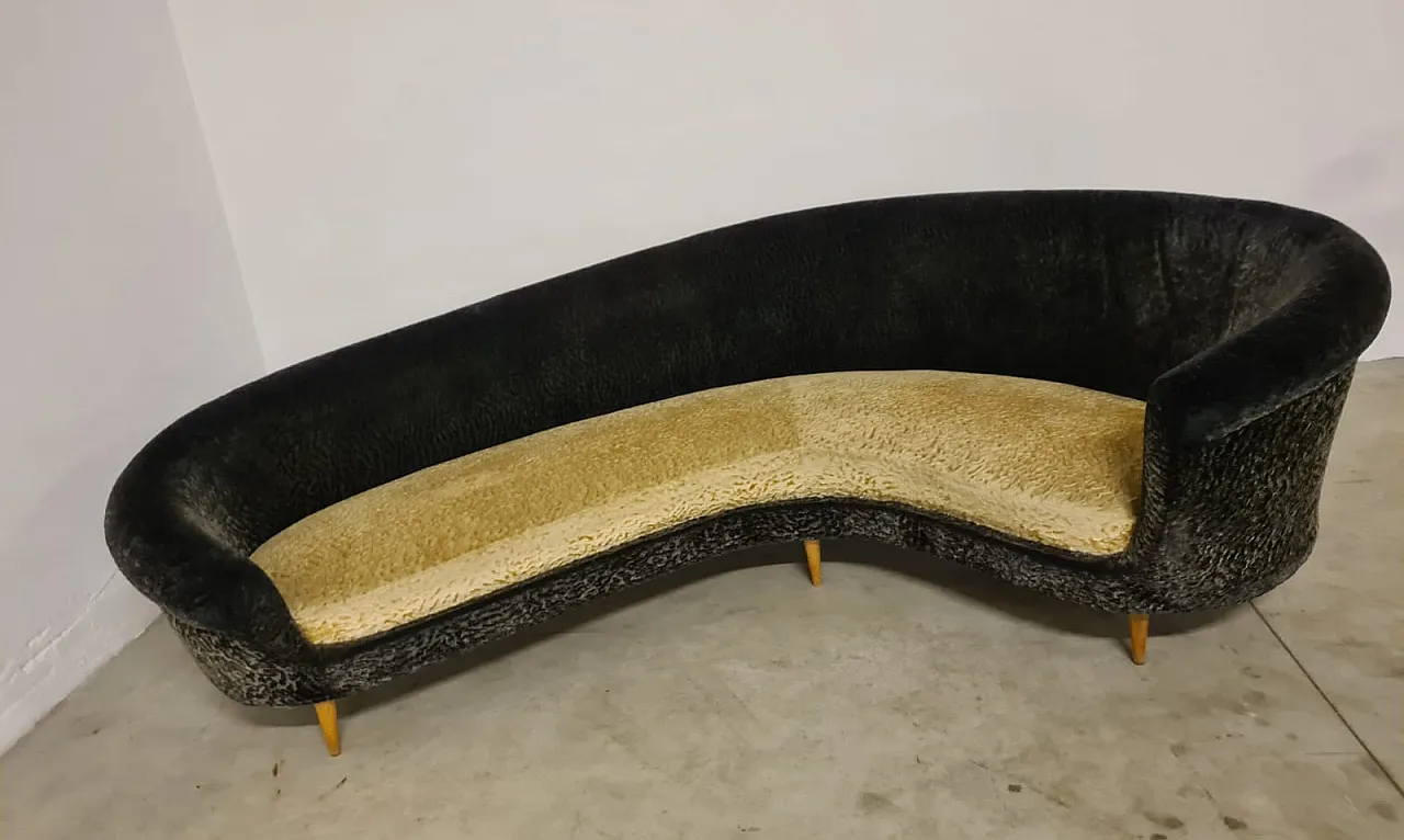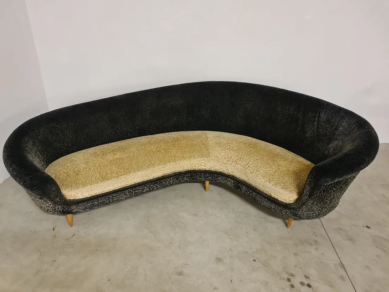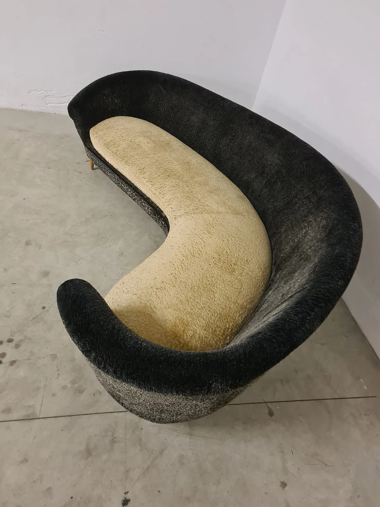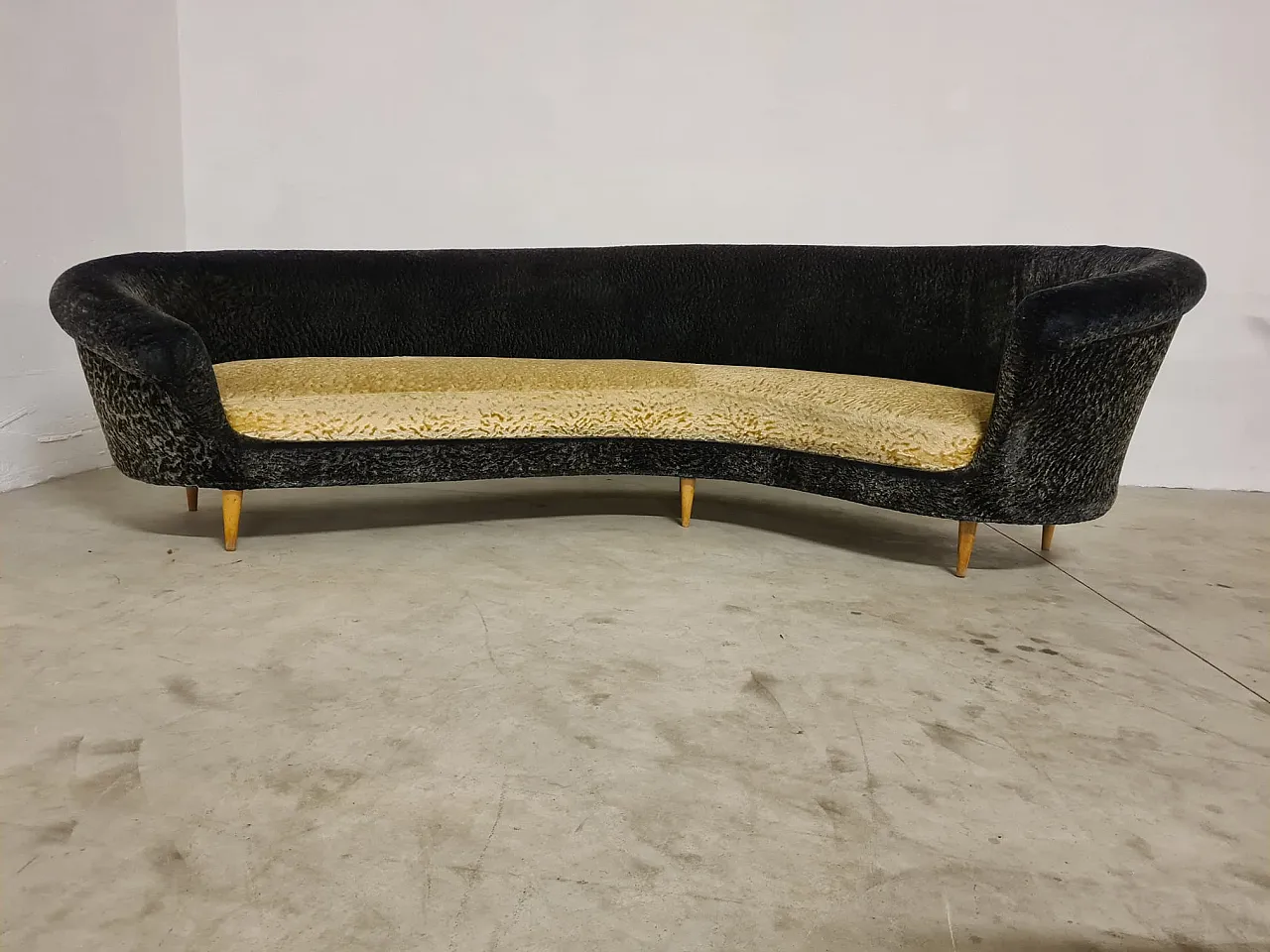Curvo sofa by Federico Munari. Elegant curved sofa of the 1950s. Ideal for a position in the center of the room so that you can grasp the beauty of the sofa from each side. Original in each part including the fabric found in excellent conservative condition despite the age. Federico Munari was a Milanese designer and inventor who made his contribution in all fields of the visual arts. Possibility to refide it at will.