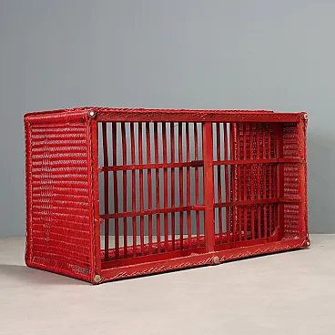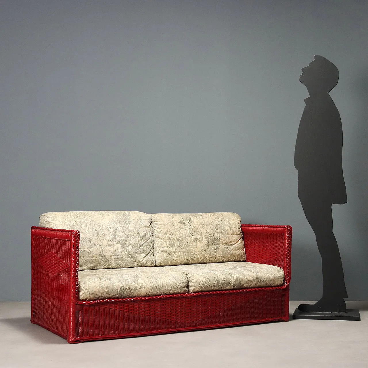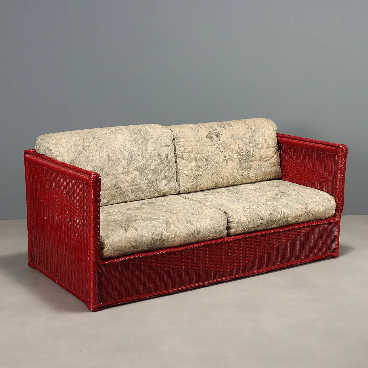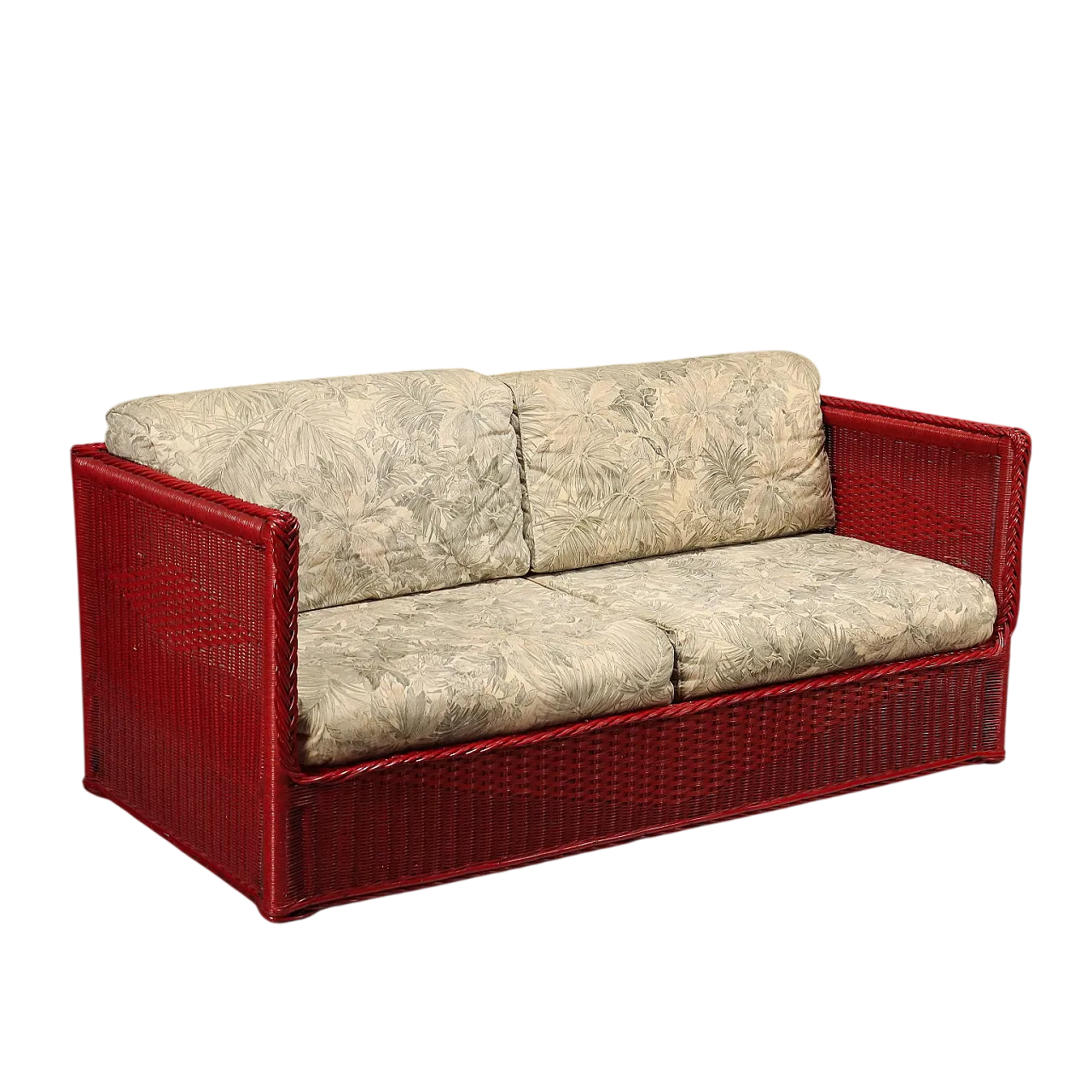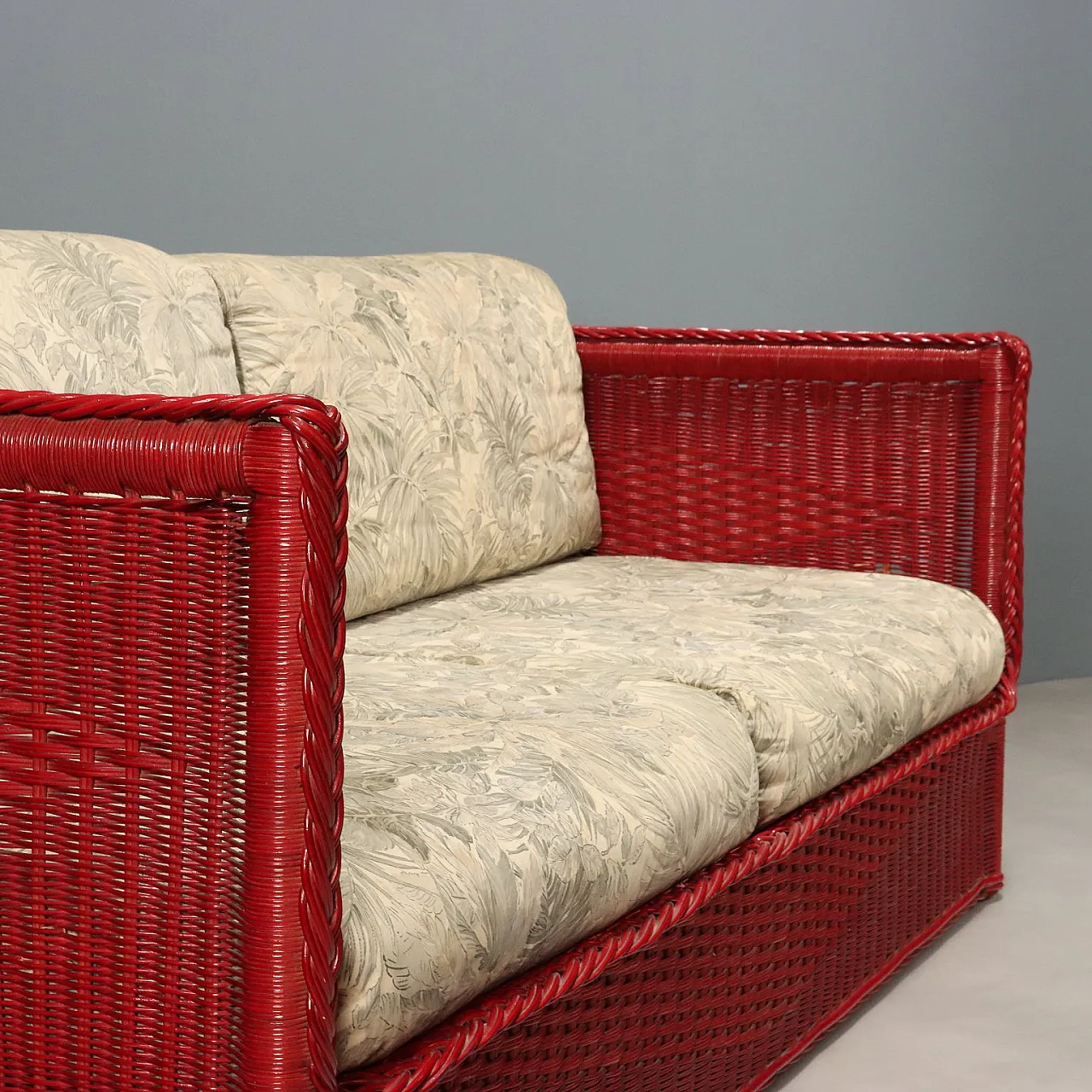 Red wicker 2-seater sofa with upholstered cushions, 1980s