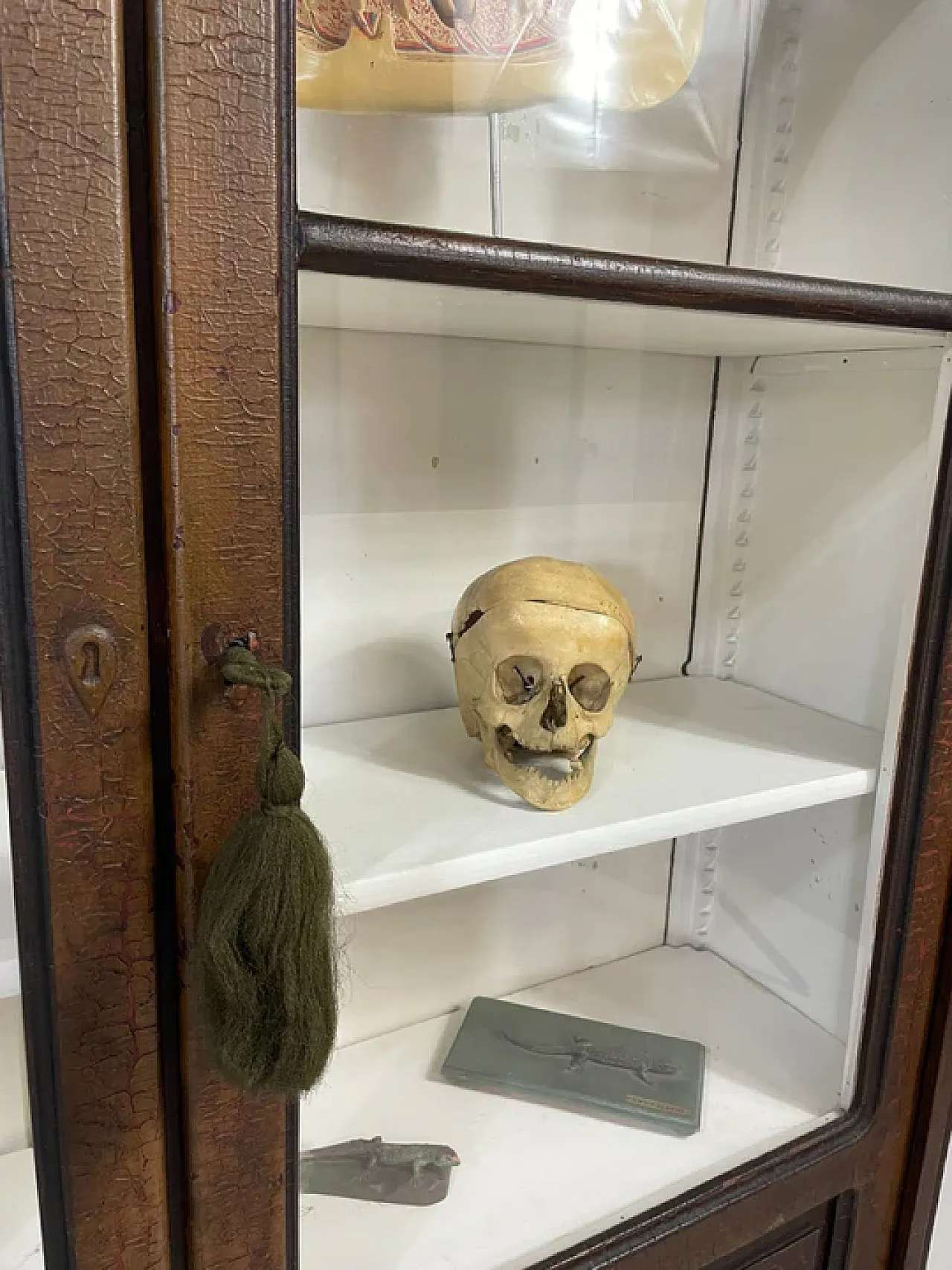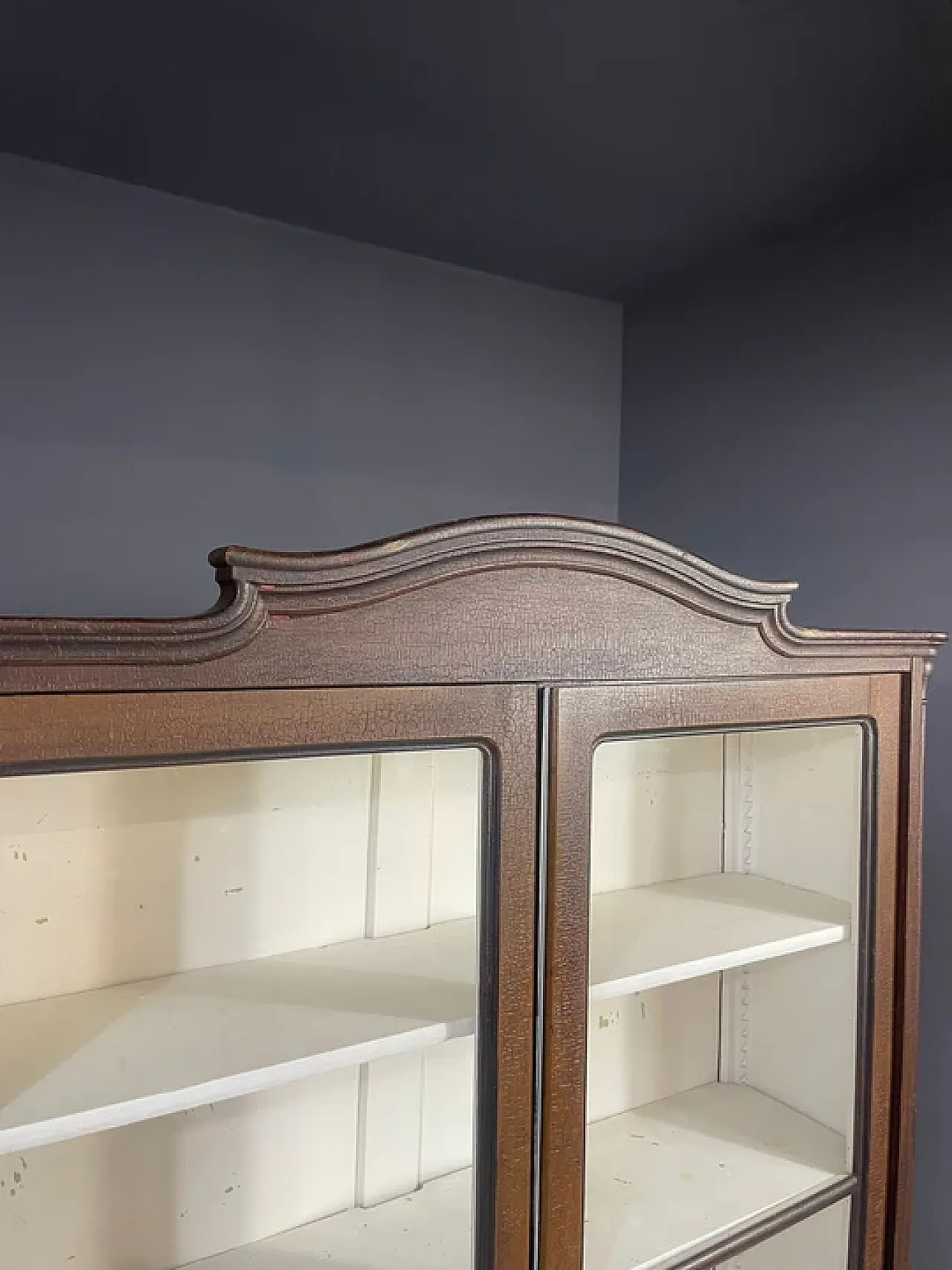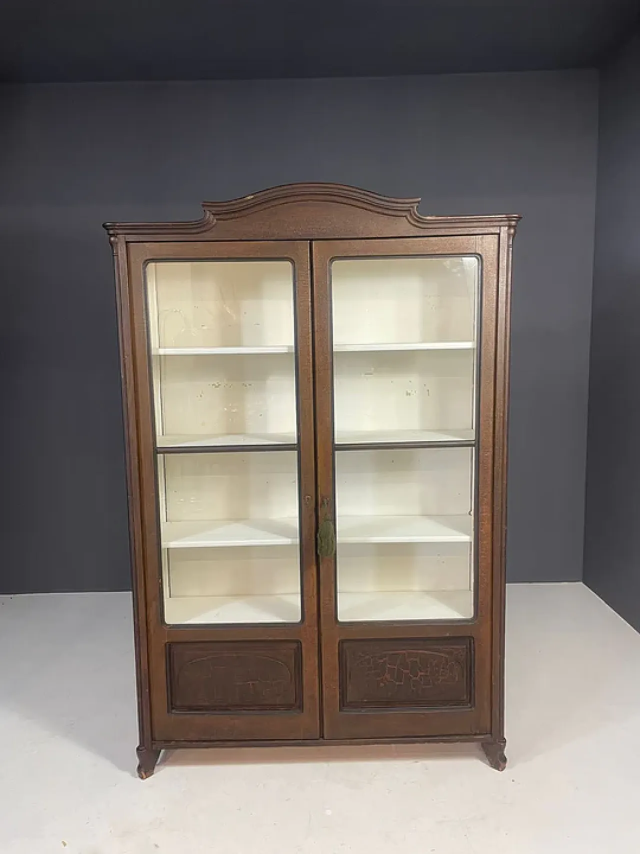 This elegant glass bookshop was made in the former Austria-Hungary between the 19th and 20th centuries. Known as a "popular" or school bookshop, it was typically used in rural schools or houses to preserve books and educational material. The piece features double glass doors finely worked with carved wooden details and original interior shelves painted in white. The original functional lock remained intact. Authentic historical school material can be purchased separately on request. The object is preserved in excellent original conditions, with only slight signs of the age.