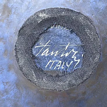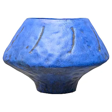 Marcello Fantoni, artistic ceramics, ceramic sculpture, 50s Italian design, tuscan art, blue enamel, Fantoni bowl, Italian modernism, Florence, vintage ceramics Marcello Fantoni, ceramic sculpture, Italian design, 1950s ceramic, blue glaze, mid-century modern, Italian pottery, Florence ceramics, Fantoni bowl Suggestive sculptural bowl made by Marcello Fantoni in the 50s in Florence. The work has a strong form, almost architectural, with sloping walls and tapered base. The cobalt blue enamel is applied in an irregular and textural way, emphasized by vertical engraved marks that evoke totemic forms. A classic example of Fantoni’s plastic and material research, between craftsmanship, primitivism and modernist abstraction. Signed under the base: Fantoni Italy.