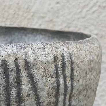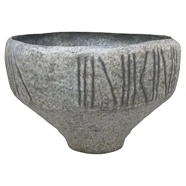 Marcello Fantoni, artistic stoneware, 60s pottery, vintage Italian design, signed ceramics, florentine art, decorative bowl, engraving on stoneware, Tuscan minimalism, stoneware bowl, Italian ceramics, 1960s design, incised pottery, signed Italian art, minimalist ceramic, Florence pottery, mid-century stoneware Elegant stoneware bowl by Marcello Fantoni made in the 60s. The rough and enamelled surface in stone grey has a regular and vertical engraved decoration that recalls archaic languages and tribal signs. The compact and sober shape recalls a refined Nordic essentiality. Signed both on the body and under the base (Fantoni Firenze Italy), it is a perfect example of the most mature and austere phase of the master ceramist. Excellent vintage condition Signed in two points: Fantoni Firenze Italy (double signature: on the body and under the base)