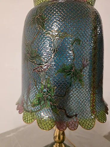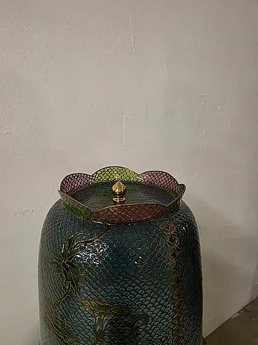 Unlike the Cloisonné, a metal background is not used, a frame with very small brass decorations is built which are then filled with layers with translucent glazes.