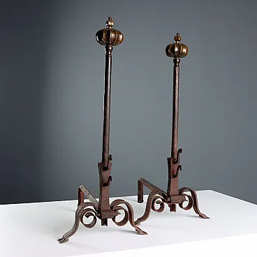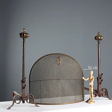 Andirons and spark guards in wrought iron and bronze, 19th century
