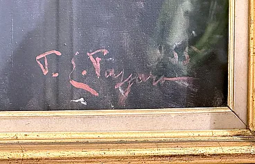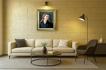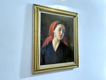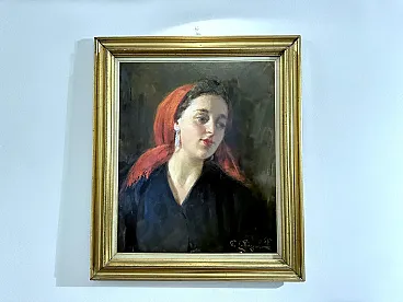 A refined portrait made by Paolo Emilio Passaro (1878–1956) in 1955, a few years after the end of his long career. This painting reflects his consolidated skill and his expressive touch in capturing the female soul in an era of artistic transition. Performed with oil on canvas, the portrait emerges for the "delicate chromatic yield" of the tones, where the softness and elegance of the figure merge into a refined and touching composition.