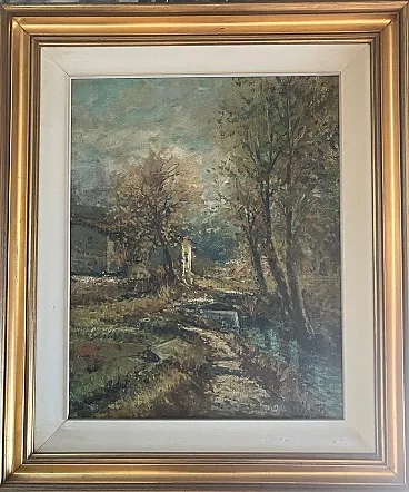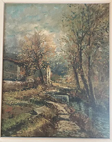 Nice rural landscape depicting a country path flanked by bare trees on the right side, which overlooks a stream or moat; In the background you can see a rustic building, immersed in a serene atmosphere. The sky is rendered with clear and fast brush strokes, creating a delicate light and melancholy atmosphere at the same time. The chromatic use is refined, with touches of color that give vitality to the painting while maintaining a lyrical and observational imprint.