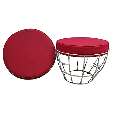 Pair of mid-century poufs/stools with white painted metal wire basket structure and round padded cushion (red textile covering). The light and graphic design –network with upper concentric circles and tapered base – recalls the modernist language of the post-war period and the European wire furniture season of the years ’50-’60. Ideal as support seats or footrests; perfect in vintage, industrial or contemporary interiors as accent elements. Not marked. No certain attribution found in online literature; generic affinity with mid-century wire stools (e.g. Panton for Plus Linje) but not identical in construction and proportions.
