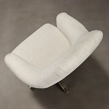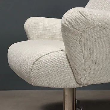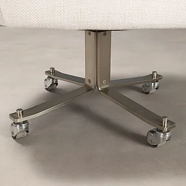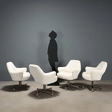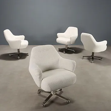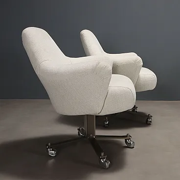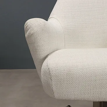Set of armchairs with four-star metal bases on casters, foam padding, and white fabric upholstery. These seats are suitable for upholstery renovations, choosing from the wide range of fabrics available in our workshops.