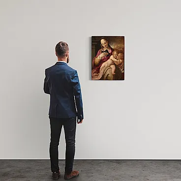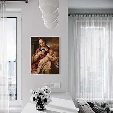 Ancient Italian picture of the 16th century. Oil work on table depicting a Madonna and Child and San Giovannino, of extraordinary pictorial quality. The Virgin is intent on reading while Jesus squeezes himself in an affectionate embrace with St. John. The pyramidal composition combines sweetness and solemnity, with typical characteristics of central northern mannerist painting.