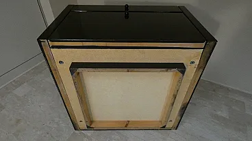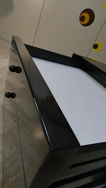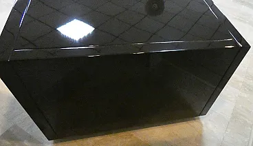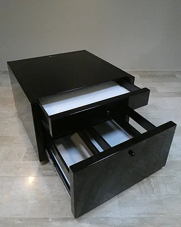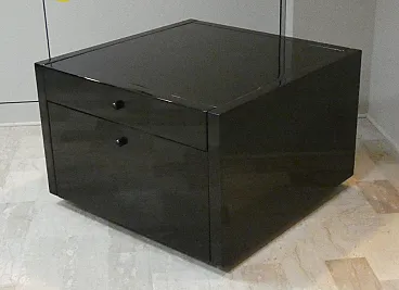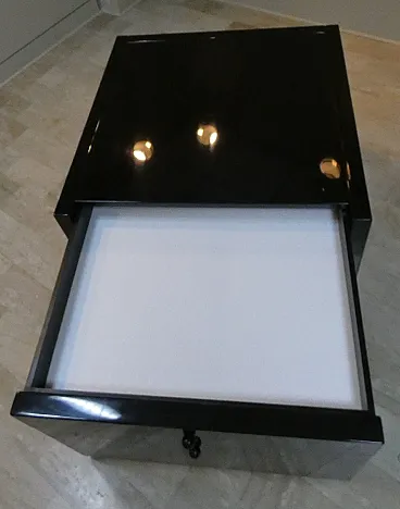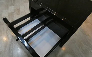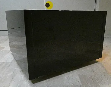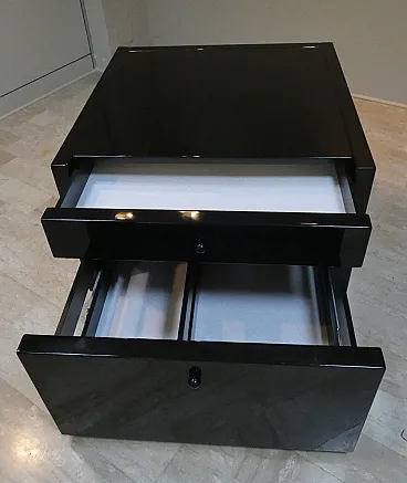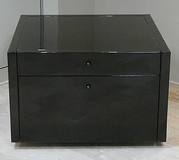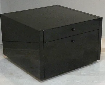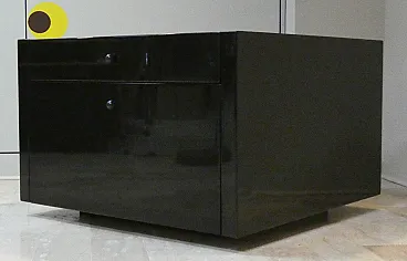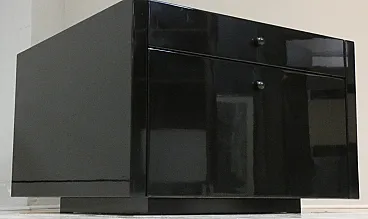 This elegant chest of drawers is part of the renowned Saratoga line, an iconic modern furniture collection designed in the 1960s by Massimo and Lella Vignelli for Poltronova. This line represents one of the first examples of modular and sectional furniture. The glossy black lacquer finish perfectly embodies the spirit of Italian modernism: clean lines, functionality, and refined aesthetics. The Saratoga line's innovative design and excellent craftsmanship have made these pieces highly sought after by collectors and design enthusiasts. Each piece in the collection is designed to be both functional and aesthetically pleasing, a combination that has defined the Saratoga line's success over time. This design piece features two drawers: the upper one is normally used for storage, while the lower one is a basket-shaped container divided into two compartments, designed for holding bottles. The clean lines and glossy appearance make this chest of drawers an ideal furnishing accessory for any contemporary space. In excellent condition with minor signs of wear consistent with its age. The chest of drawers has been restored. Dimensions: H. 60 cm, D. 92.5 cm, W. 90 cm