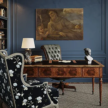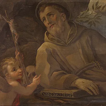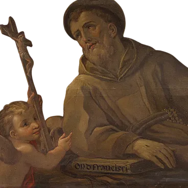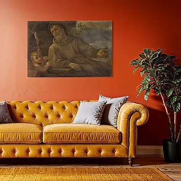 Saint Francis looks intensely at the crucifix and is leaning on a large book with a devotional inscription "Op. d. Francisci" which alludes to the works of the Saint. Painting of fine pictorial quality which stands out for the expressiveness of the Saint's face and the sweetness of the little angel, and manages to transport you into a mystical and intimate atmosphere.
