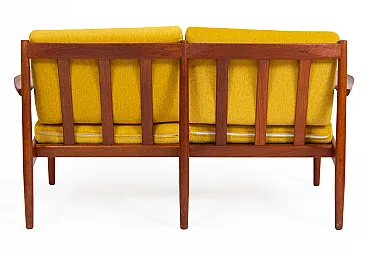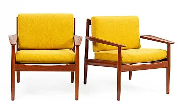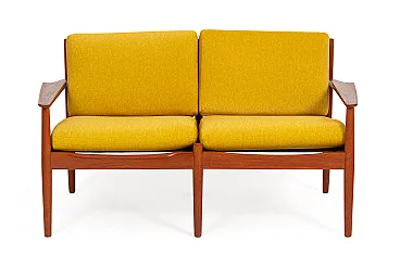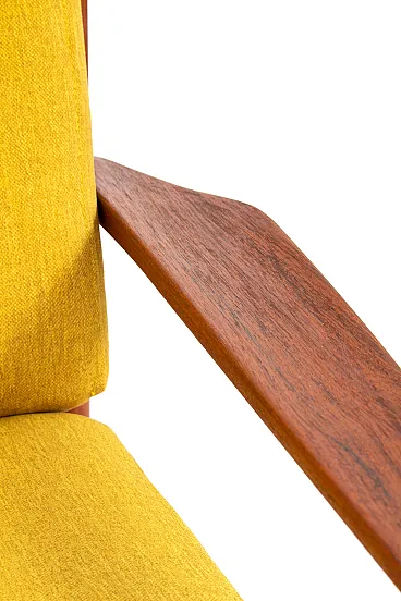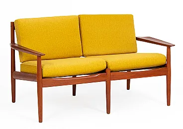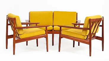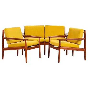 Arne Vodder Sofa Set for Glostrup Møbelfabrik, 1960s. Yellow armchair set consisting of a sofa and two armchairs in mid-century modern style. The set was designed by Arne Vodder, a renowned Danish furniture designer, who styled a wide range of items in the 1950s and 1960s, at a time when Denmark was receiving international recognition for its furniture. He is known for the originality and timelessness of his style. His works are simple and modest, crafted in natural materials such as rosewood and teak, and, in particular, are free of sharp edges. His pieces include tables, desks, sofas, and hall furniture, inspired by nature with soft, organic, elegantly curved lines. He has worked with exotic woods and colorful materials. Vodder has always envisaged the interplay of form and function, for example, new drawer shapes to avoid handles. His works were very popular on the American market, in the 1960s, the furniture not only reached the White House but could be seen in banks, airline offices, embassies, and hotels across the globe. Reupholstered. Armchairs: 73 x 69 x 72 cm (2 pieces). Sofa: 130 x 73 x 72 cm.
