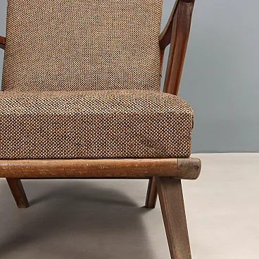 Pair of vintage armchairs with exposed wooden legs and armrests, foam padding, and original period gray fabric upholstery. These seats are ready for upholstery and upholstery renewal, choosing from the many options available in our workshop.