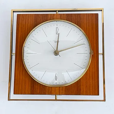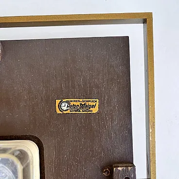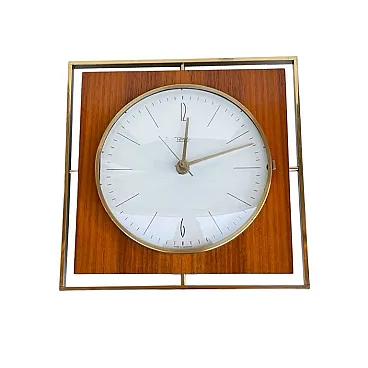 The 17 cm diameter dial is set in a brass frame, with simple hour markers and slender hands. The entire piece is mounted on a warm-toned veneered wood background, framed by a geometric brass frame. The clock combines elegant simplicity with high-quality craftsmanship.