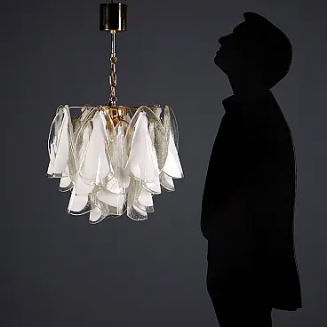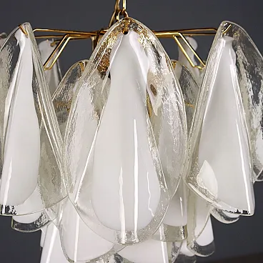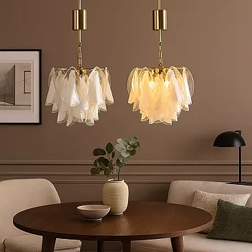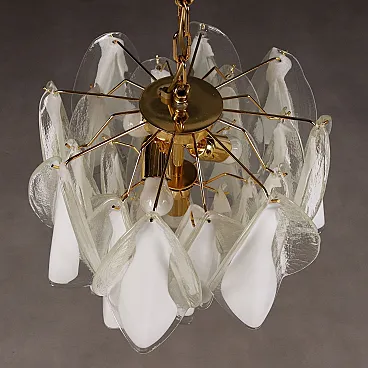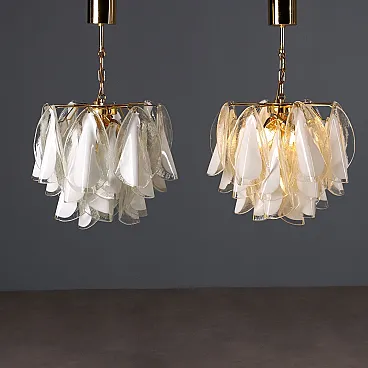 Pair of pendant lamps with a gold-plated metal structure and white and transparent Murano glass elements.
