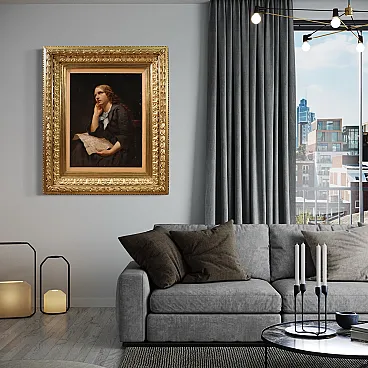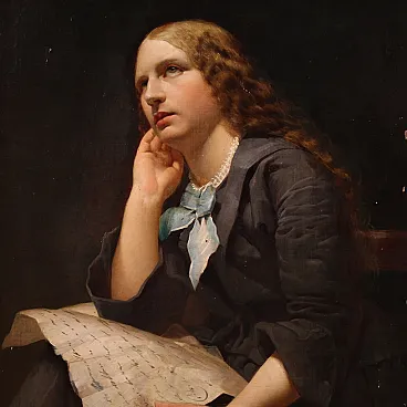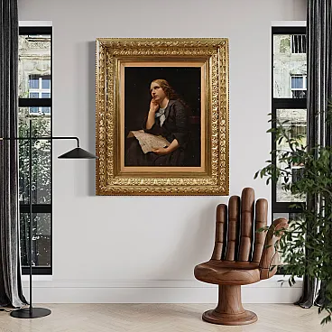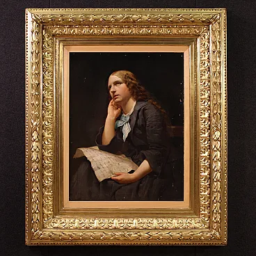 Wonderful Italian painting from the 19th century. Oil on canvas, first canvas, depicting a young woman absorbed in her thoughts, of extraordinary pictorial quality. The girl with long blonde hair is dressed soberly with a delightful light blue ribbon around her neck. She is caught in a moment of absorbed meditation while holding a piece of paper in her hands, probably a letter from her distant lover.