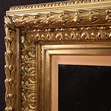 Large painting, ideal for classic or contemporary environments where you want to introduce a hint of grace and poetic contemplation. Spectacular 20th century frame in finely carved and gilded wood, highly decorative, with some signs of aging. There is a small wooden passepartout used to adapt the painting to the non-coeval frame. Work with some small drops in color (see photo), overall in good state of conservation. Painting light H 90 x W 70 cm.