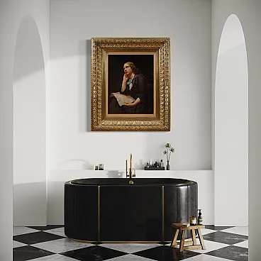 The composition, balanced and elegant, develops vertically on a neutral background, thus highlighting the psychological aspect of the face. The light, coming from the right, carefully models the facial features and enhances the softness of the hair and the pearly complexion. The attention to detail and the taste for feminine melancholy refer to Italian academic painting of the second half of the 19th century.