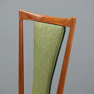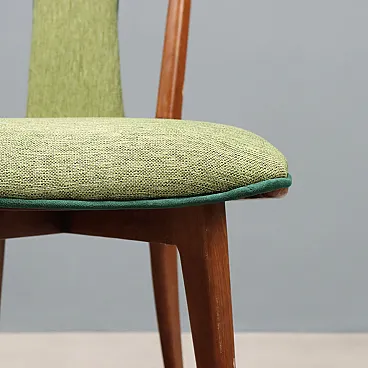 Set of eight elegant vintage dining chairs with wooden frames, foam-padded seats and backrests, and fabric upholstery in shades of green. The chairs are ready for wood restoration and upholstery renewal, choosing from the many options available in our workshop.