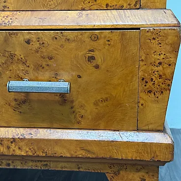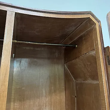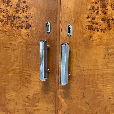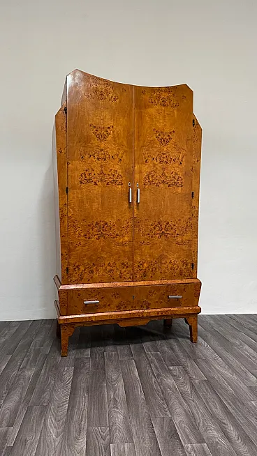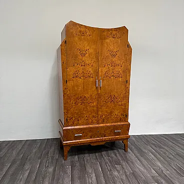 Elegant birch burl wardrobe, made in Italy in the 1940s. The piece stands out for its sinuous, geometric lines typical of the Art Deco style, with a refined interplay of symmetries and a splendid flamed grain that enhances the surface.