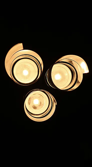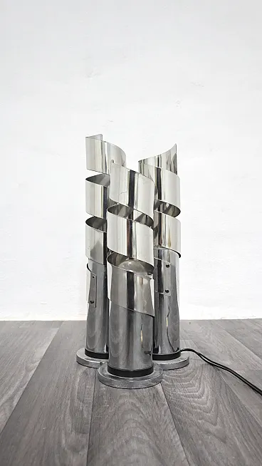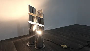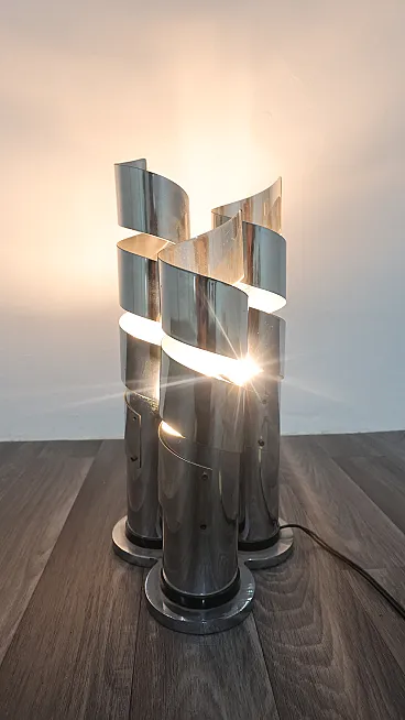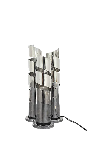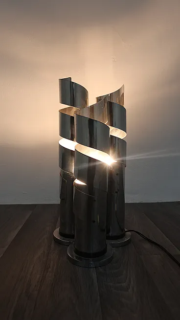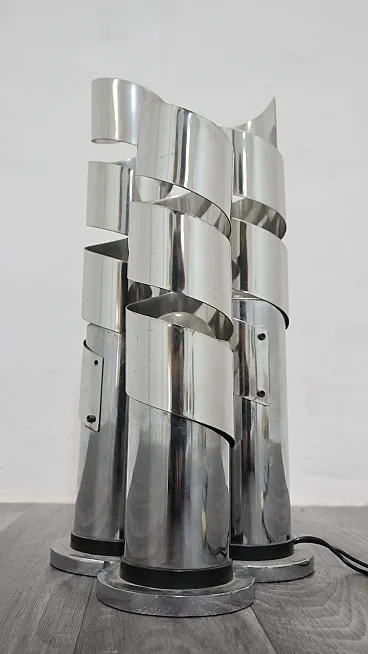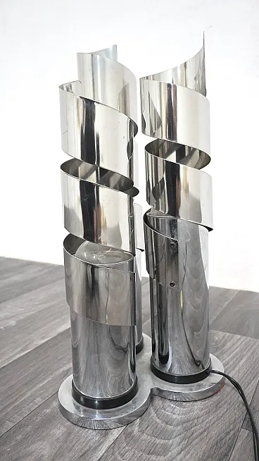 Elegant chromed steel table lamp featuring a refined spiral design that envelops the light in a play of reflections and geometric patterns typical of the 1970s style. Attributed to designer Max Sauze, this lamp combines sculptural lines and functionality, becoming a true collector's item for lovers of vintage design.