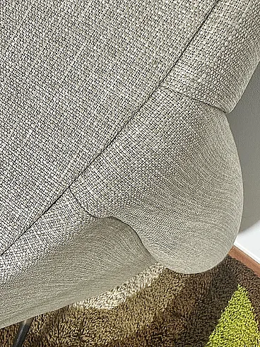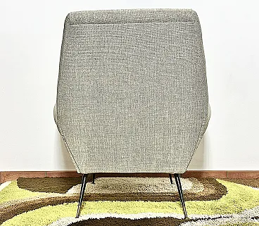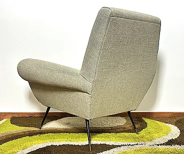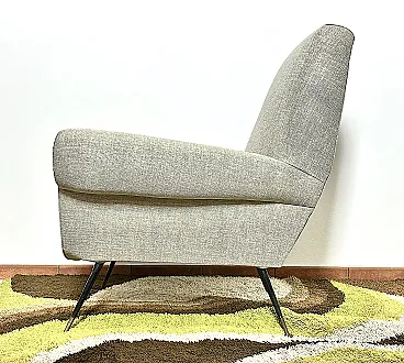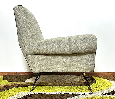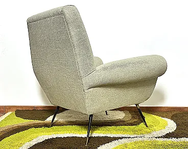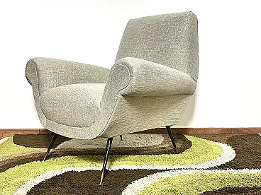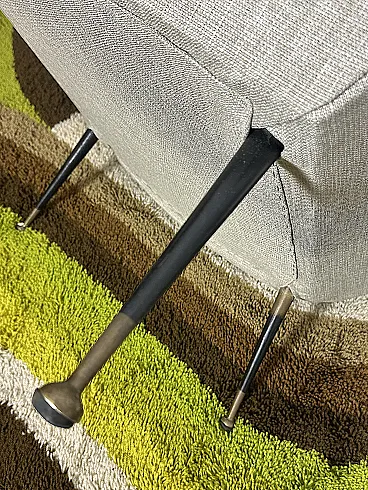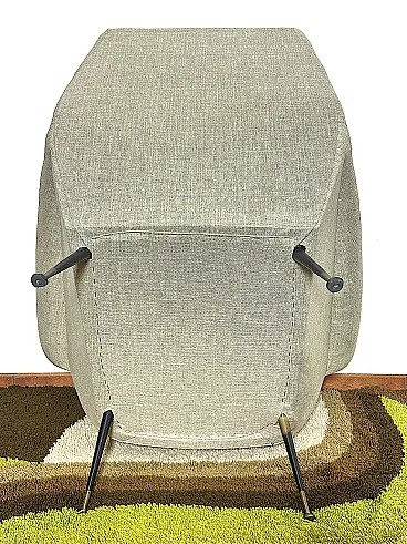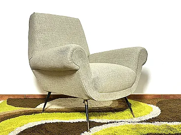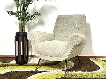 Extraordinary armchair from the 1950s by designer GIGI RADICE, an icon of Mid-Century design. This piece perfectly embodies the elegant and sophisticated aesthetics of the era, with a harmonious design and refined details. Characterized by a slender structure, the armchair rests on tapered brass and metal legs, a distinctive element of Radice's creations, which give lightness and refinement, while the careful stitching and delicately rounded profile draw attention to high-level manufacturing. Completely restored, new interior and upholstery, the upholstery is in Sand (Beige) colored cotton. PERFECT CONDITIONS Measurements: Height 90 cm - Width 90 cm - Depth 80 cm - Seat 50 x 45 cm - Seat height 45 cm