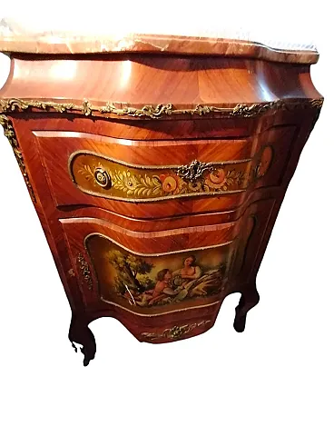 Il Piccolo Cassettone Comoncino Intarsiato con Bronzi e Marmo Bois de Rose è un raffinato mobile d'epoca che unisce eleganza e funzionalità, tipico dello stile classico e decorativo. Realizzato con materiali pregiati e rifiniture di alta qualità, questo comò si distingue per la sua struttura compatta e i dettagli ricercati che ne esaltano la bellezza.