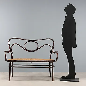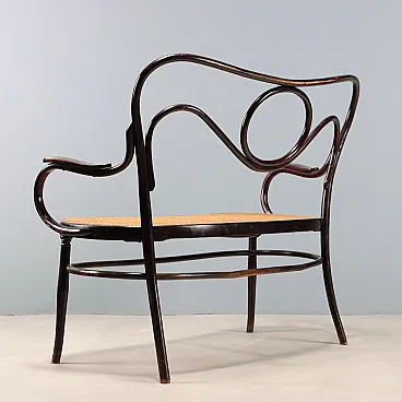 Two-seater sofa in curved beech, stained walnut, Thonet style. Open back and cane seat. Austria, late 19th century.