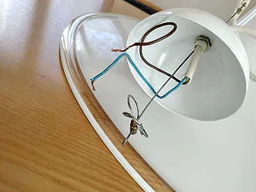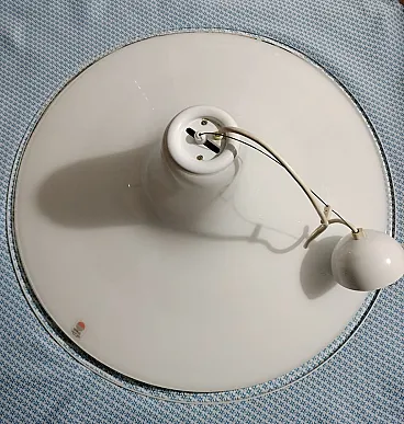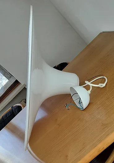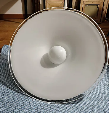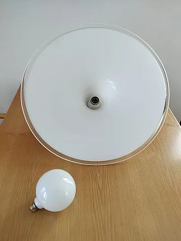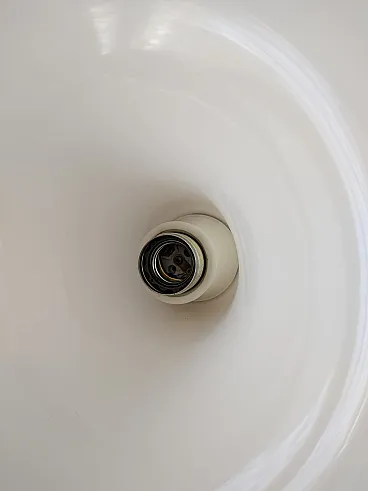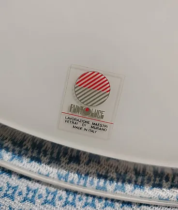 Pendant chandelier in milk glass from the Punto Luce factory in Murano, produced in the 1970s. Structure in white milk glass shaped like a hat enriched by transparent edging, complete with original support of the time and original manufacturer's label. Space Age style, diameter 61cm, height approx. 20cm, weight approx. 5.6kg. The lamp seen in the photos is not working, it must be replaced with a new one. This chandelier is in excellent condition but is more than 50 years old so it is recommended to entrust the installation to a technician after checking the integrity of the hooking system (steel cable and connection screws) and the electrical part.