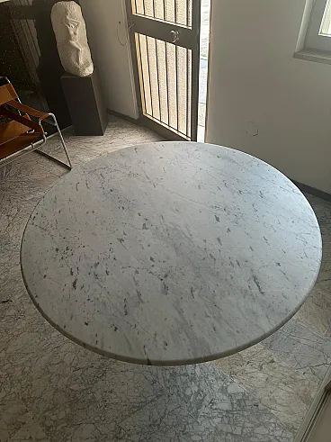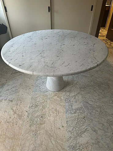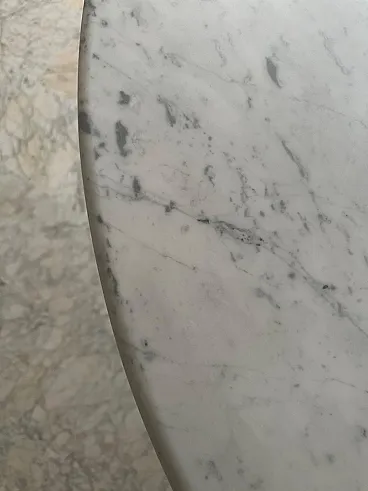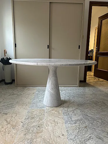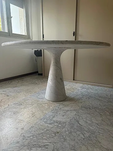 The M1 dining table, designed by Angelo Mangiarotti in 1969, is a stunning piece of Italian craftsmanship that embodies the elegance and sophistication of mid-century modern design. This iconic table, made in Italy, is made of fine Carrara marble, known for its refined gray veins on a white background, which add a touch of natural beauty and timeless charm to any space.