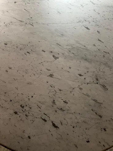 The restoration process involved removing the yellowed polyester paint and refinishing the marble. A UV-resistant satin (semi-matt) acrylic coating was then applied, which gave the marble a very natural appearance, whilst protecting it from the elements. This careful restoration enhances the aesthetics of the table.