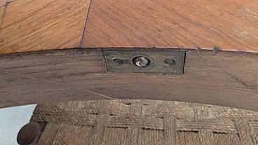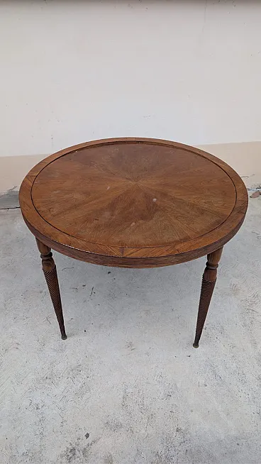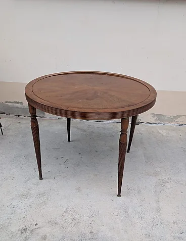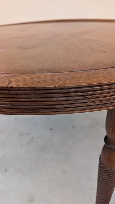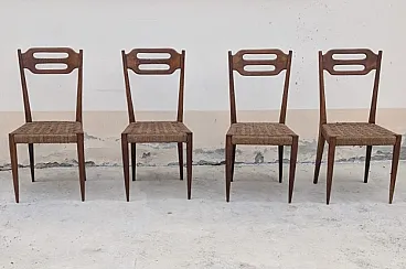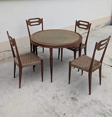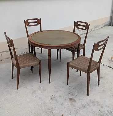 This exceptional set, composed of a table and four chairs, is a prime example of Italian Rationalist design from the Interwar period (circa 1930s-1940s). Made in Italy, this set features essential, strict lines and a simple, functional structure, which are distinguishing characteristics of Italian Rationalism. Italian materials only were used to create this set, as autarchic policies were in force during the historical period in which the set was created. Indeed, the table and the chairs structure are made in solid oak, while the chairs seats are created in hand-woven wicker. A unique feature is the table's rotating surface, allowing both sides to be used.