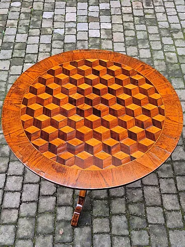 Refined inlaid Rolino coffee table, typical of the famous Rolo factory. Furniture from the second half of the 19th century. The top is richly decorated with geometric cube-shaped creations, while the foot, finished with threads, highlights the whole even more. Object intact and nice size.