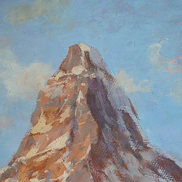 Three oil paintings on cardboard. All three panels are signed in the lower right corner. The three paintings together create a single, continuous composition: the central panel depicts the summit of Mount Cervino, while the two lower panels extend the mountain range on both sides to the most famous peak. Alessandro Catalani painted views and landscapes, in oils and watercolors, characterized by soft colors and loose brushstrokes. The work is presented in a contemporary frame (to be restored).