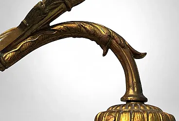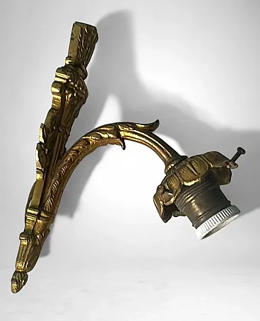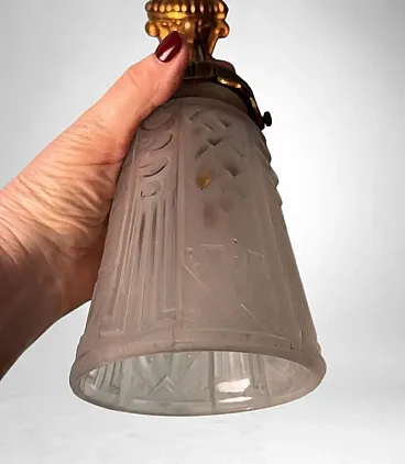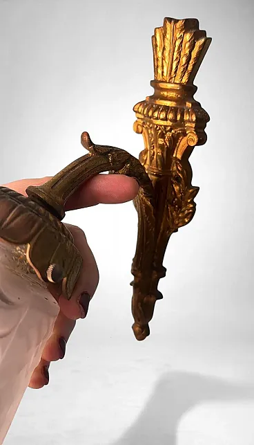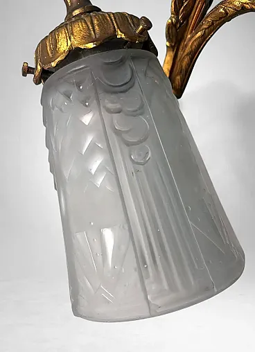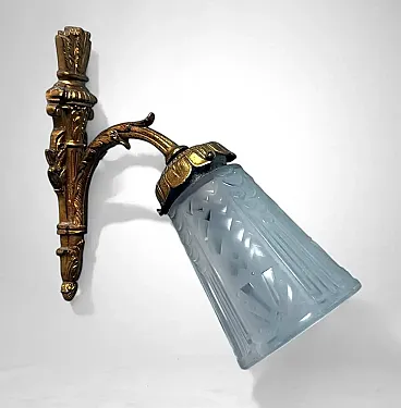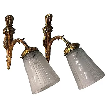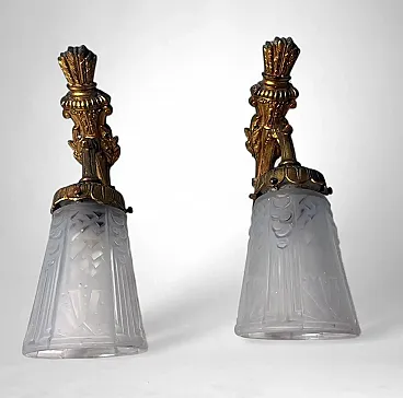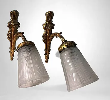 This refined pair of French wall sconces embodies the elegant spirit of 1920s Paris. The gilt bronze mounts, finely cast and richly detailed with scrolling foliage and floral motifs, support tailored cut-glass shades that diffuse a soft, atmospheric glow. The sconces perfectly reflect the transitional style between Art Nouveau and Art Deco, characteristic of early 1920s France. Their sinuous lines, stylized floral decoration, and the harmonious combination of gilt bronze with frosted and cut glass highlight the aesthetic dialogue of this hybrid period. The quality of the bronze casting suggests production by a distinguished Parisian or Nancy workshop, both renowned centers of Art Nouveau and Art Deco craftsmanship. The hand-cut frosted glass recalls the work of celebrated French glassmakers such as Daum, Muller, or Schneider, who collaborated with bronziers and goldsmiths during this period to create exclusive lighting pieces. It is therefore plausible that these sconces were crafted between 1920 and 1925 by an artisanal atelier specializing in ornamental lighting, possibly commissioned for an affluent household. The proportions are well balanced, the bronze casting of superb quality, and the glass hand-cut with great precision. Their versatility makes them suitable for a variety of interiors: placed alongside period furniture (Louis XVI revival, burl or marquetry pieces) or damask wall coverings, they enhance the soft glow of their golden finish; mounted on white or pastel walls, they bring a refined vintage accent to modern interiors; used as ambient lighting in an entryway or bedroom, they create a warm and elegant focal point. In conclusion, this pair of sconces represents a true jewel of French lighting from the 1920s, seamlessly adaptable to both historical settings and contemporary design environments. Their balance of decorative richness and formal purity, combined with the refinement of materials, makes them highly desirable for collectors and discerning interior designers. The sconces are in good overall condition; only the electrical wiring, original to the period, is recommended for replacement. Dimensions: Depth 25 cm (9.8 in), height 23 cm (9 in), width 11 cm (4.3 in).