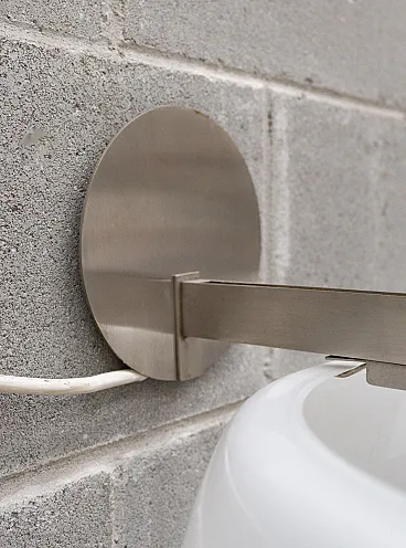 The lamp consists of a diffuser made of opaline blown glass, mounted on a nickel-plated brass structure and with a characteristic double curvature that allows a glimpse of the internal luminous sphere, also made of white opaline glass. This contrast between pure geometric shapes (sphere and cap) and the transparency/opacity of the glass is the distinctive feature of the model: the light is diffused in a soft and enveloping way, creating a refined atmosphere and enhancing every environment in which it is placed