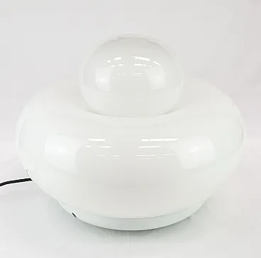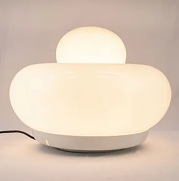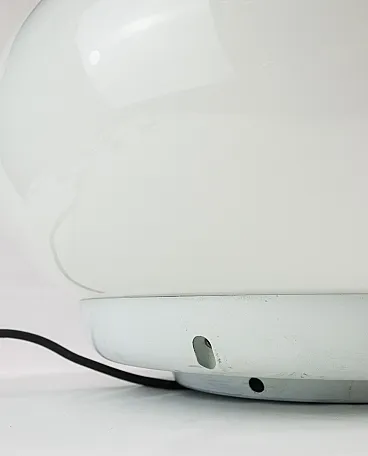 The white opaline glass diffuser rests on a painted metal base, with the characteristic organic shape with three overlapping elements that allows for soft and uniform light scattering