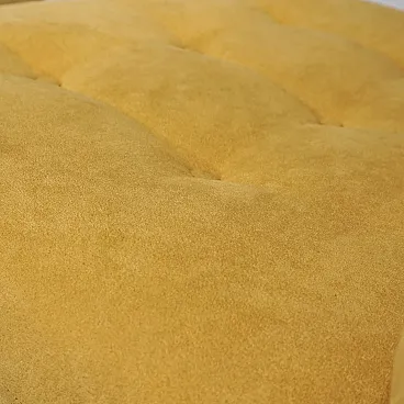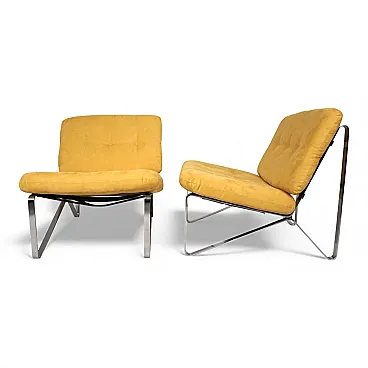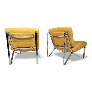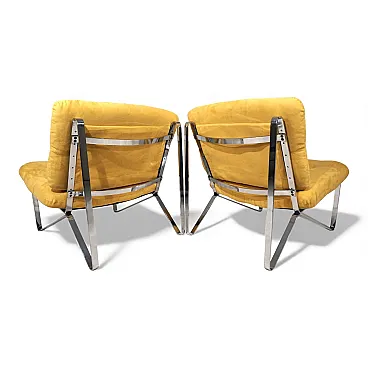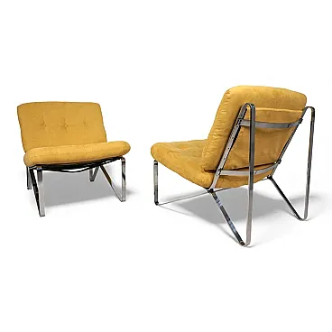 The solid chrome frame has a minimal patina, lending the armchairs character and authenticity. The seat and back cushions are upholstered in a mustard-colored, Alcantara-like fabric and are in mint condition—a harmonious blend of comfort and style. The cushions offer excellent seating comfort.