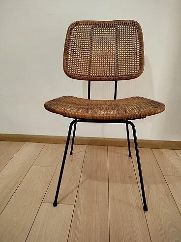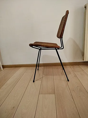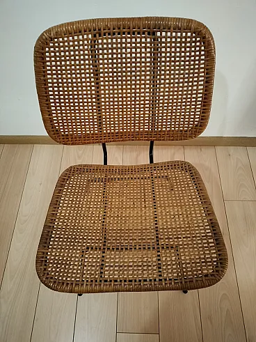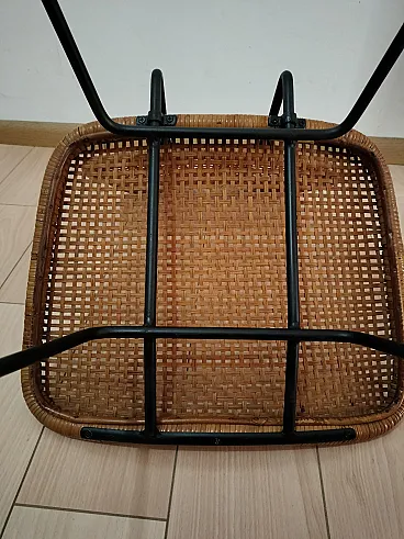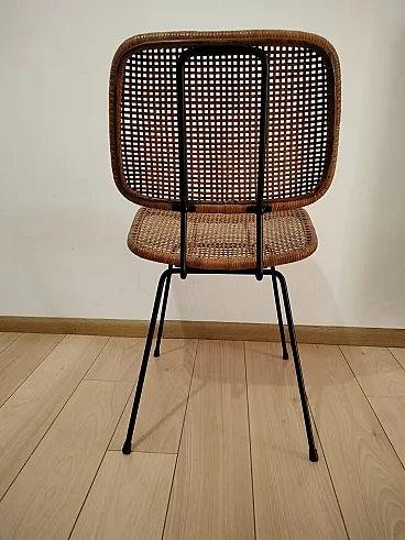 Chair with black painted iron rod structure, rounded seat and back in woven wicker. Italian production from the 1960s, there are no brands. The design is reminiscent of the Dirk van Sliedregt model 550 chairs from the 1950s. The dimensions are these: seat height 45 cm in front 41 cm behind, seat width 46 cm in front 42 cm in back, seat depth 37 cm, seat diagonal approximately 51 cm, backrest width 42 cm at the bottom 37 cm at the top, backrest height 31 cm, distance between backrest and seat approximately 10 cm, total height of the chair approximately 81 cm, weight approximately 3.8 kg. The iron structure was recently cleaned of rust and old paint and repainted black again, some screws were replaced because they were rusty.