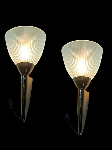 Set of 2 Blue Murano Glass and Brass Wall Lamps A fine pair of mid century style sconces, featuring elegant ribbed light blue Murano glass shades paired with elegant polished brass frames. Subtly tinted glass creates a delicate, atmospheric light, while elongated brass supports add a luxurious, sculptural touch. Perfect for hallways, bedrooms, living spaces or to add a touch of Italian glamor to contemporary interiors. Details: - Height: 27.5cm - Width: 14cm - Depth: 14cm - Material: Murano glass and brass - Light source: 1 × E14 bulb (each) - Condition: Freshly rewired, ready to install - Origin: Italy - Period: Mid-century style