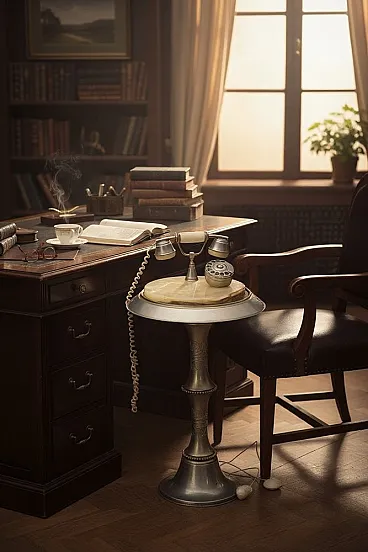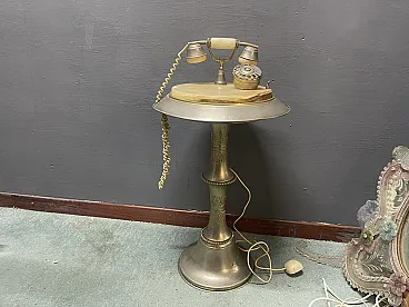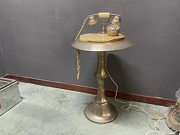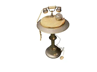 Vintage Marble and Brass Telephone Table with Rotary Dial Telephone (Mid 20th Century) This vintage telephone table is a well-preserved example of mid-20th century design, featuring an elegant combination of brass-colored metal and richly veined marble. The piece, 74 cm tall and with a 40 × 40 cm top, offers a compact yet sculptural presence, suitable for an entryway, a corner of the living room or a decorative vignette. The circular table top is made of warm-toned marble with natural variegations, set in a flared metal edge. The pedestal base, adorned with ornamental reliefs, adds a refined and classic touch. A telephone with a brass rotary dial and faux marble accents rests on the table, completing the nostalgic charm of the ensemble. With its harmonious blend of materials and distinct retro elegance, this telephone table makes an eye-catching decorative statement. It is ideal for collectors of vintage telephones, mid-century interiors or anyone looking for a unique piece with authentic character. Dimensions - Height: 74 cm - Width: 40 cm - Depth: 40 cm