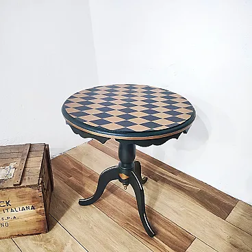This round coffee table is a piece that combines elegance and functionality. Its finish is Selva Nera, with a touch of Copper in the details that enhances its classic silhouette. The circular surface is decorated with a diamond pattern reminiscent of Alice in Wonderland. The central base, with its stem and tripod legs, gives stability and a touch of distinction. Perfect for a reading corner, next to a sofa or as a bedside table, this coffee table is a testament to classic design adapted to contemporary needs, adding a touch of mystery and sophistication.